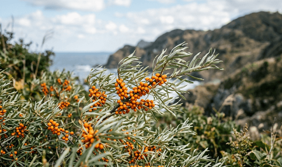 サジー(学名:Hippophae rhamnoides L.)は、ユーラシア大陸を原産とするグミ科の落葉低木です。別名「シーベリー」や「シーバックソーン」とも呼ばれ、鮮やかなオレンジ色の小さな実をつけます。